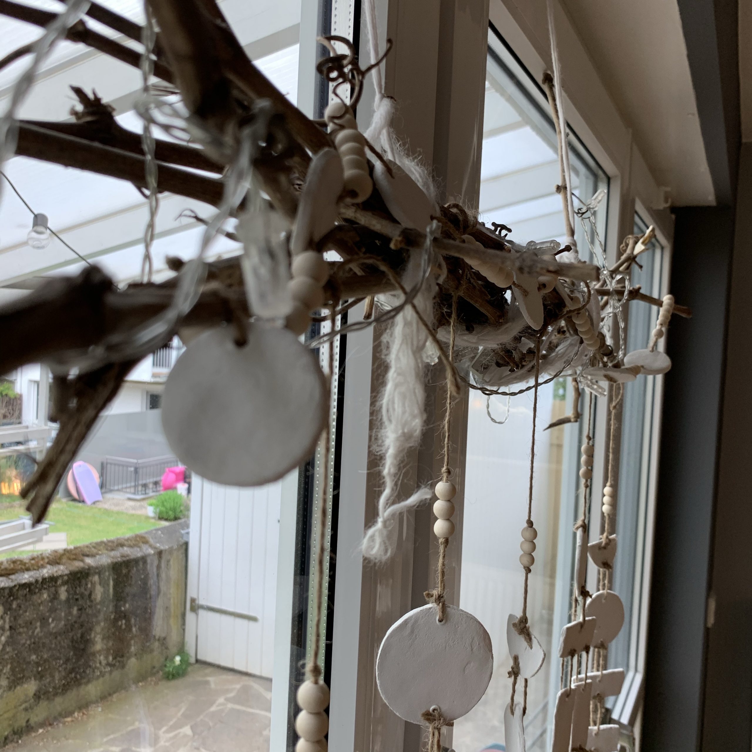 Ostern kam und ging, aber der Rebenreisig blieb beständig an unserem Fenster, um ihn verschieden zu dekorieren. Im ersten Jahr dauerte es ziemlich lange, bis mir etwas eingefallen ist. Schließlich brauchte es etwas, das bis Weihnachten mehr oder weniger ganzjahrestauglich ist 😉
